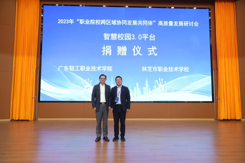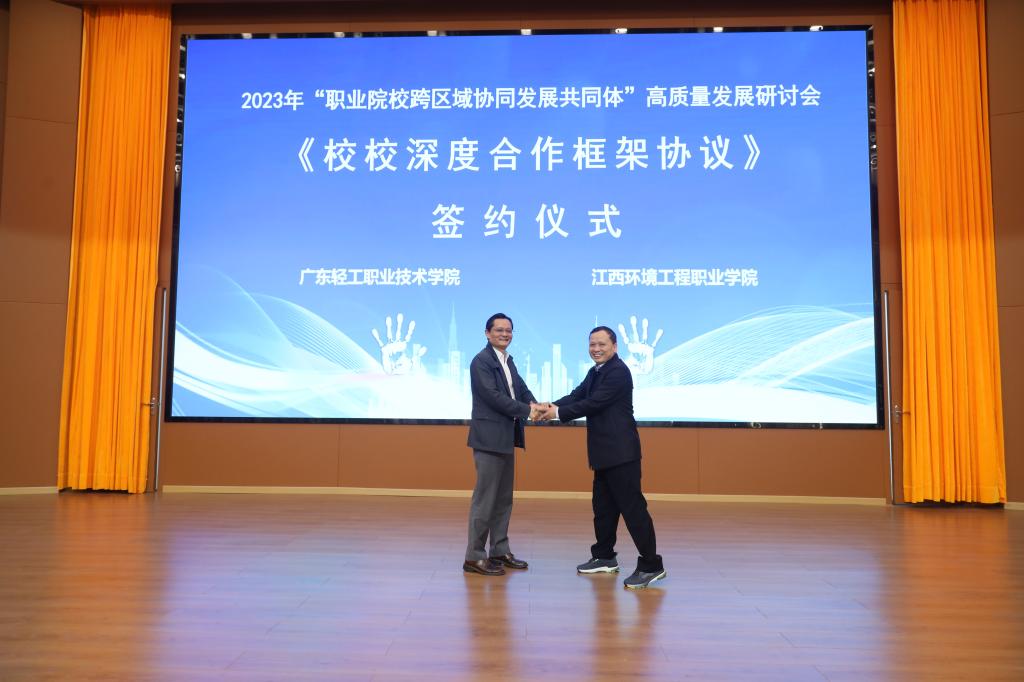 在会议上午的现场签约环节中,达成了政校合作共建签约1项、校校签约1项、校企共建产业学院、产业研发基地签约4项,捐赠2项。主要包括:教育部高校思想政治工作创新发展中心(广东轻工职业技术学院)与赣州市信丰县人民政府共建“大思政”实践教学基地;广东轻工职业技术学院与江西环境工程职业学院签订校校深度合作框架协议,助力赣南老区职业院校融入大湾区,更好地服务区域经济社会发展。广东轻工职业技术学院向西藏林芝市职业学校捐赠智慧3.0平台,同时联合华为、科大讯飞公司向甘肃培黎职业学院捐赠智慧课室,充分发挥广东省“双高”校职业教育资源辐射带动作用,为打造高质量的职教帮扶“朋友圈”“辐射圈”贡献广轻力量。