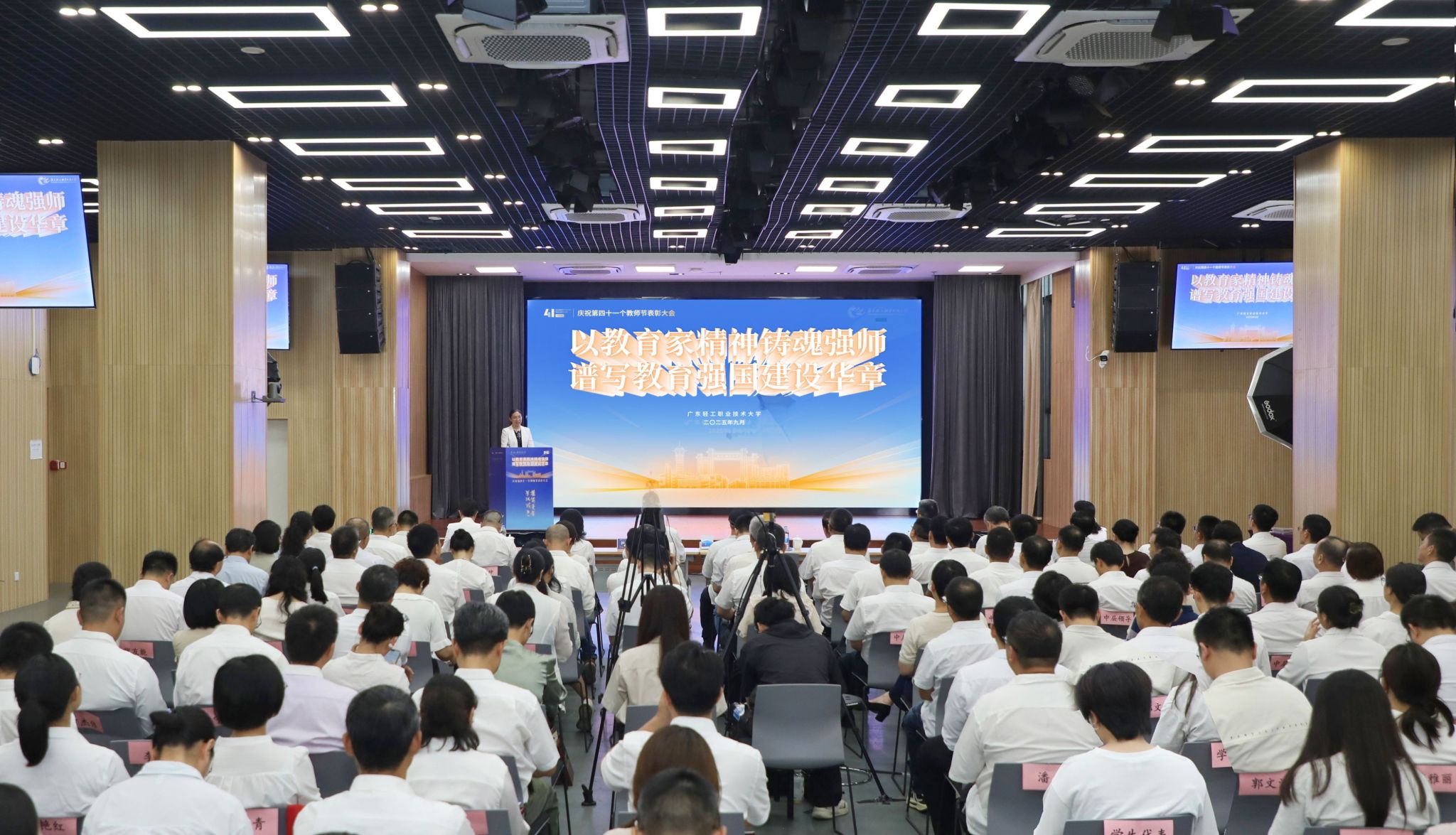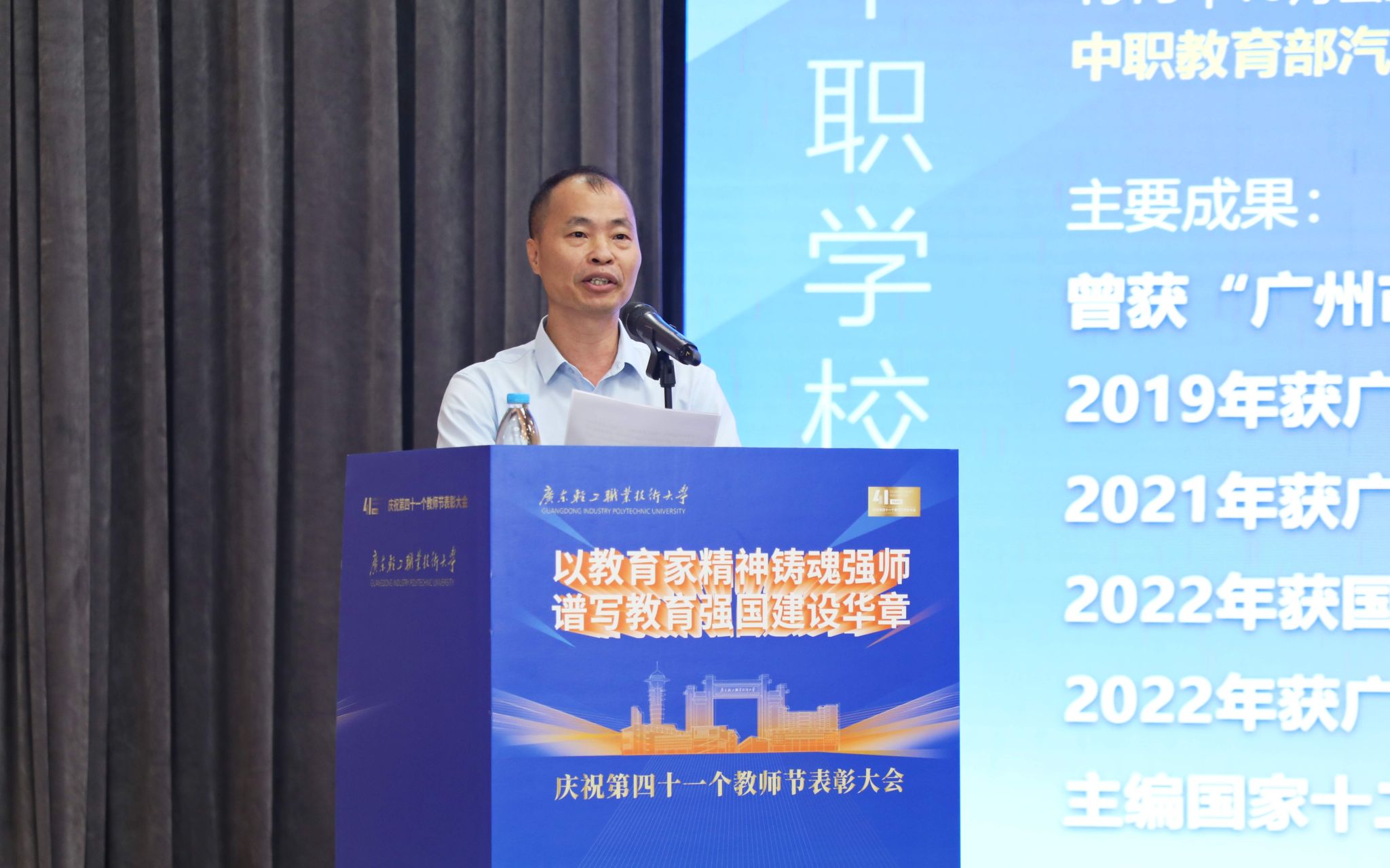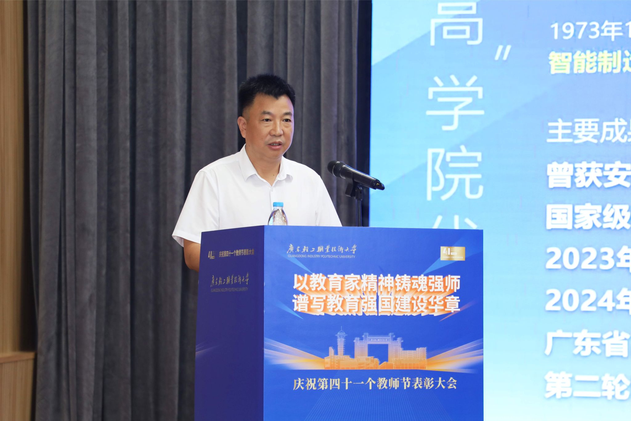 杨欣斌在致辞中向扎根职教沃土、默默耕耘的广轻人,致以敬意和节日祝福。他表示,回望过去,因团结奋斗而成就广轻高度,一代又一代广轻人秉持“自强、敬业、求实、创新”的广轻精神,取得一项又一项突破性的成绩。眺望未来,以团结奋斗而铸就广轻精彩,职业本科建设千帆竞发。强大的师资队伍是学校发展的 “定盘星”,是向更高水平迈进的“开拓者”和“主力军”。学校将持续优化教师发展生态,以更扎实的举措为大家成长铺路搭桥,以更暖心的服务解决老师们的后顾之忧,让每一位教职工都能在学校找到施展才华的广阔天地,拥有干事创业的坚实舞台。希望广轻大每一位教师坚定理想信念,言为士则、行为世范,既当传授知识的“经师”,也做培根铸魂的“人师”。