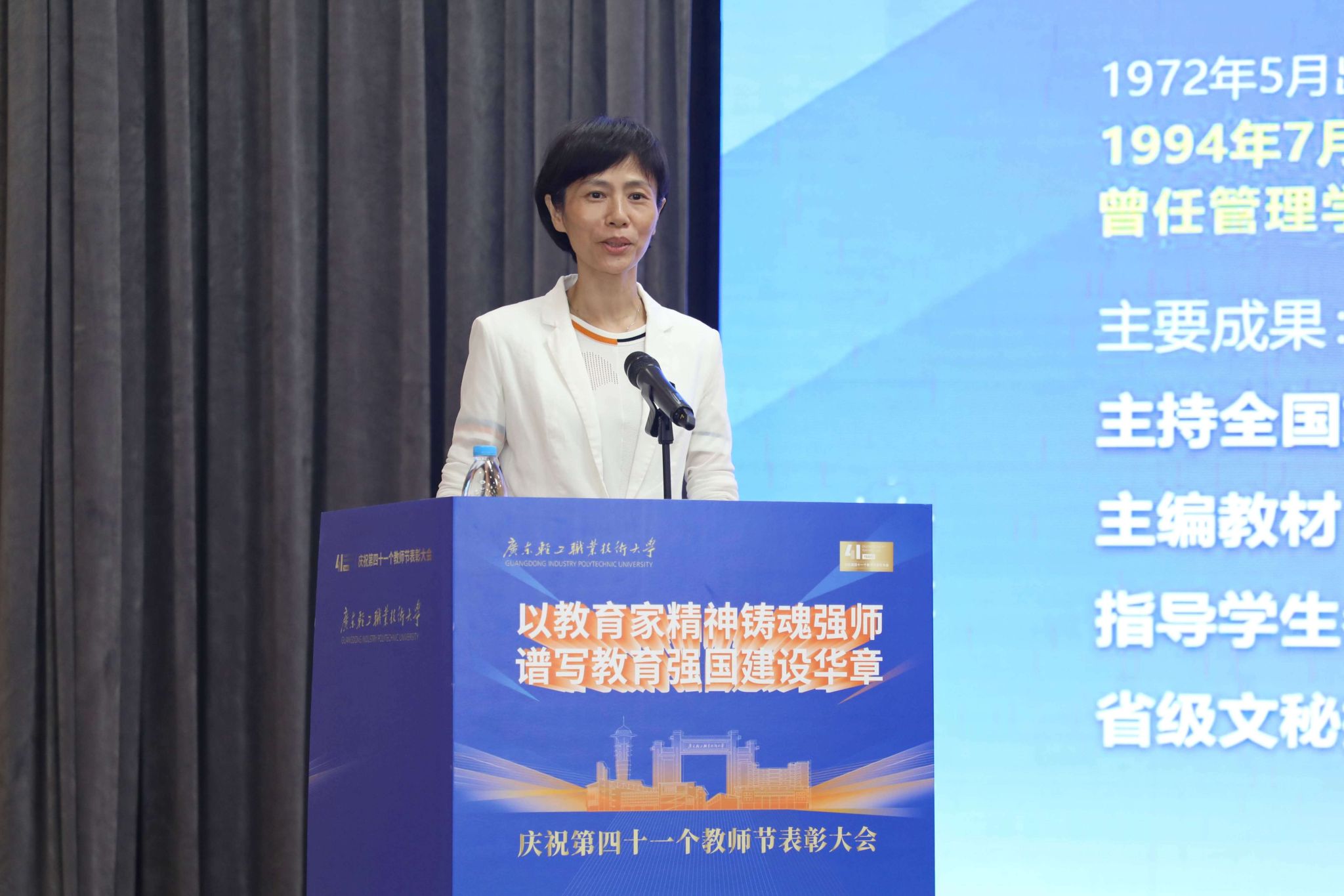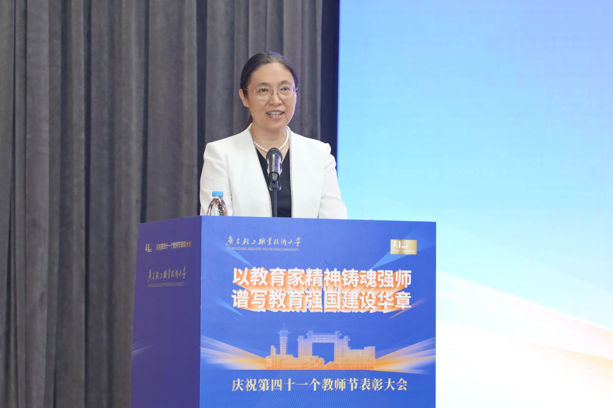 陈爽代表学校党委,向受到表彰的集体和个人表示祝贺,向全校教职员工、离退休干部教师表示感谢并致节日问候!她表示,当前,学校正处于转型发展、爬坡过坎的关键时期。新的征程上,我们有职业本科大发展的“天时”、粤港澳大湾区现代产业发展的“地利”、新一届班子团结奋进的“人和”。学校党委将始终抓牢教师队伍建设这一战略性工程,将师生福祉作为学校改革发展的重要出发点和落脚点,全心全意依靠教职工办学,希望大家把思想和行动统一到学校发展战略上来,持续涵养师德、提升能力,为办高水平本科大学奋楫笃行,为成就“百年名校”荣耀共同奋斗。