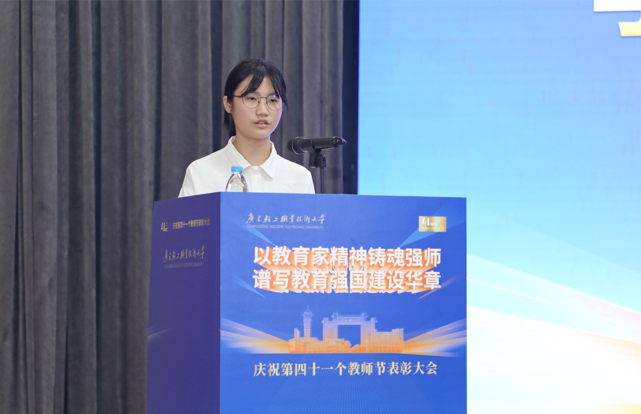 随后,优秀教师、学生代表在会上发言。广东省高层次人才、材料学院副教授李美表示,十年来,我连续八年担任高分子专业班主任,看着一批批学子从青涩到成熟。我始终坚信,职业教育的生命力在于与实践结合、与产业对接。因此,我积极带领学生投身科研项目,将课堂所学转化为解决实际问题的能力。我们的学生团队以项目成果为依托,先后获得了“互联网+”国赛金奖、“挑战杯”国赛特等奖。作为青年教师,我将继续坚守立德树人初心,以培养更多高素质技术技能人才、能工巧匠为己任,将个人发展融入学校高质量发展,为探索中国特色的职业教育发展之路贡献自己的绵薄之力!
