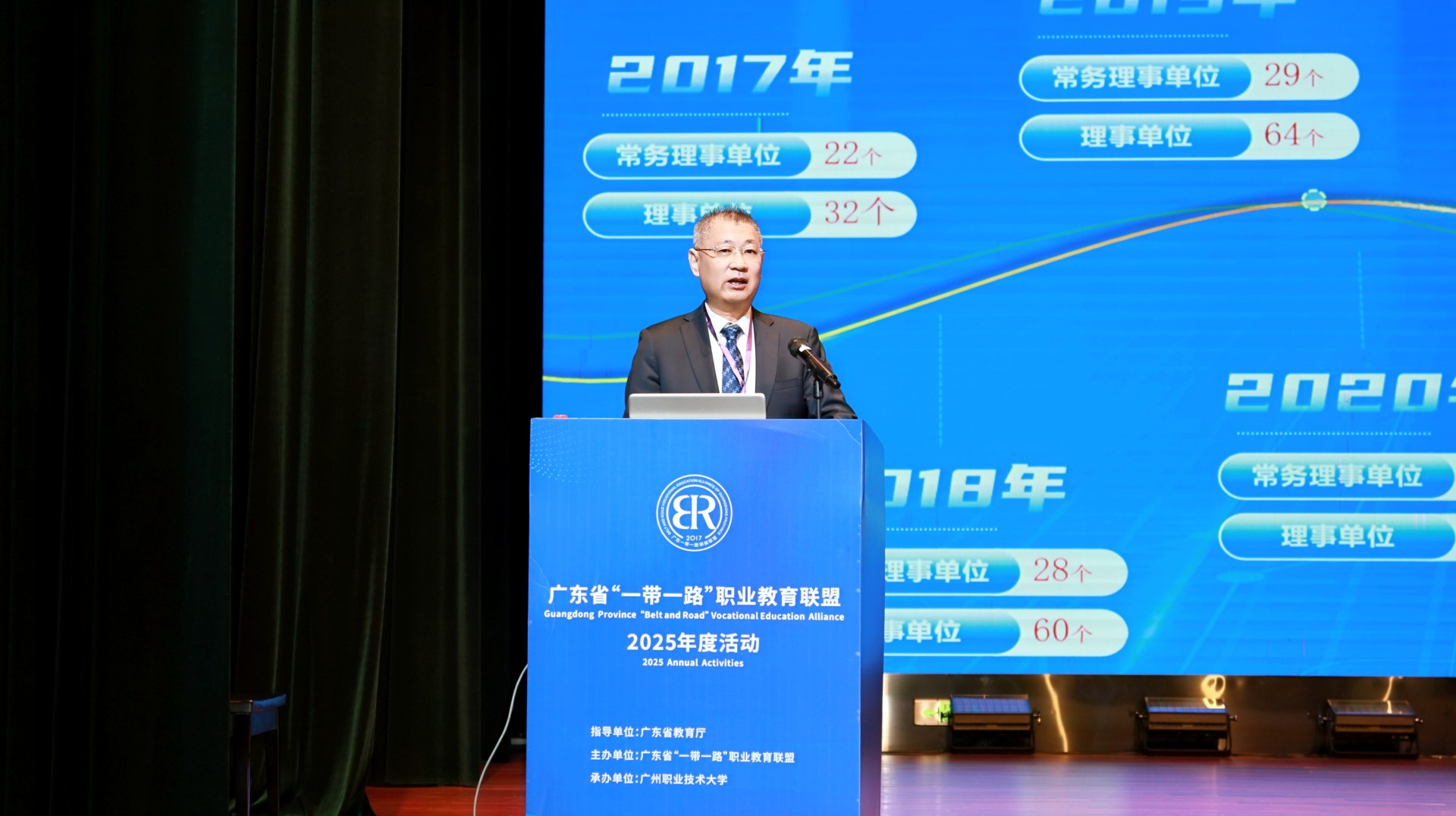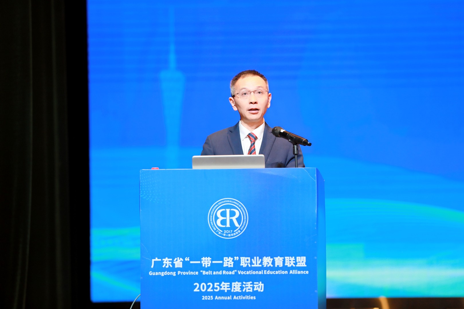 11月14日,由广东省教育厅指导、广东省“一带一路”职业教育联盟主办的2025年度活动在广州举行,省教育厅二级巡视员方树生,省教育厅交流合作处处长李金俊、省教育厅交流合作处副处长周柳余,省财政厅四级调研员许健昶,南京工业职业技术大学党委书记谢永华、广州职业技术大学校长马仁听,联盟理事长、我校校长杨欣斌,我校副校长李荣等出席,来自15所国外院校、42所省内外院校、20家合作行业企业的200余名代表参与。活动现场展示了我校等12所首批“岭南工匠学院”的建设成果,并为第二批10所“岭南工匠学院”建设单位授牌。6所省内院校分别与乌兹别克斯坦、日本、韩国等多个国家和地区的院校及企业成功签订7个重要合作项目。