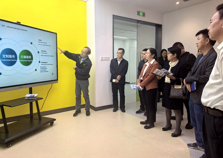 调研组一行首先参观了港科广的红鸟学创空间,详细了解学校以“枢纽”和“学域”为核心的创新学术架构及其在交叉学科建设方面的先进理念和落地成效。随后,调研组实地走访了材料、设计和制造中央实验室,全域互联与网联智能研究中心,多功能高聚物薄膜中央实验室和生物科学中央实验室等多个高水平实验室。实验室负责人向调研组详细介绍了平台在材料性能测试、高通量筛选、智能制造等领域的先进设备与技术支撑能力。