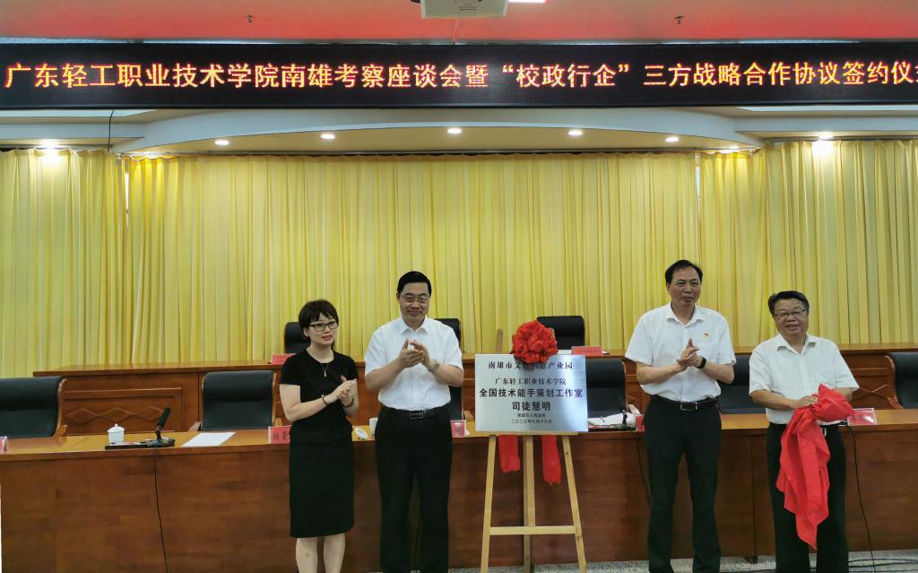 会后,何人平、卢坤建、我校管理学院院长刘生华为南雄市文化创意产业园“司徒慧明全国技术能手策划工作室”揭牌。