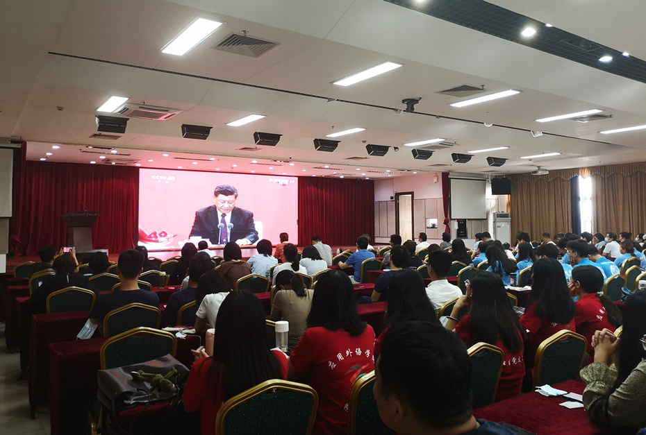 我校组织全体党员干部在广州校区第二实训楼903、南海校区北区图书馆二楼会议室集中观看大会直播。校内师生还纷纷通过电视、网络、“学习强国”学习平台等方式观看大会直播,认真学习习近平总书记在庆祝大会上的重要讲话精神。