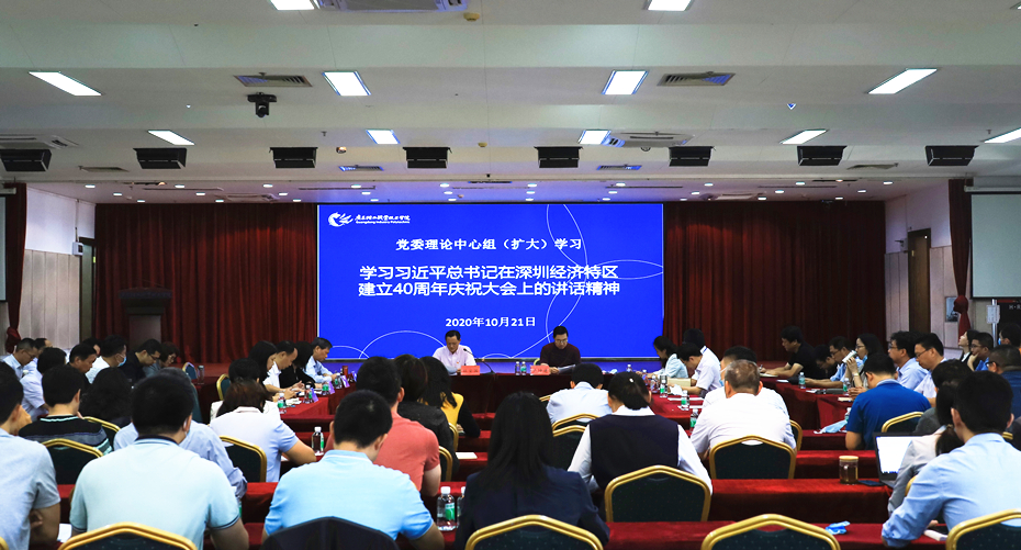 10月21日上午,学校举行党委理论学习中心组(扩大)学习会,专题传达学习贯彻习近平总书记出席深圳经济特区建立40周年庆祝大会和视察广东重要讲话、重要指示精神,并深入研讨和部署具体的贯彻落实措施。党委书记杜安国同志主持学习并讲话。学校党委班子成员及各职能部门负责人、二级学院领导班子、科研处、校企合作办、教务处、人事处副科级以上干部、高级职称教师代表参加了专题学习。
