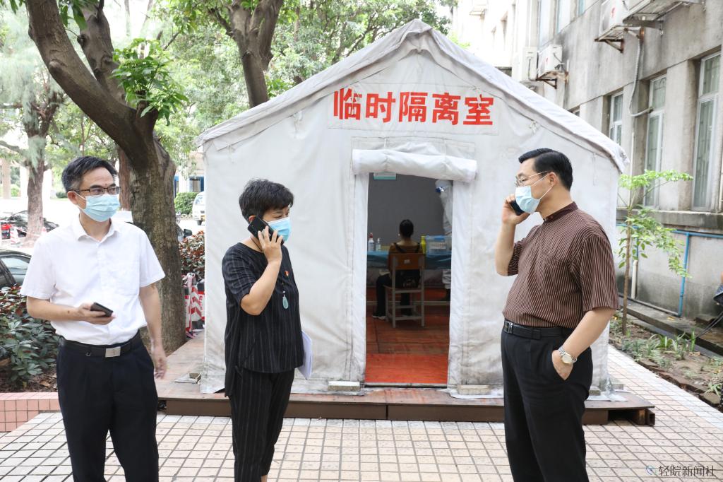 社区卫生服务中心工作小组及卢坤建一行,深入食堂、图书馆等容易形成人员聚集的公共场所对防疫工作进行指导。