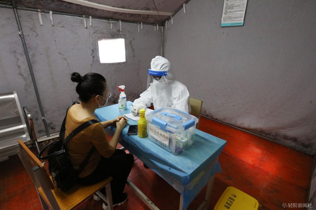 “患病学生”来到医务室分诊点,由预检分诊点护士进行体温测量和初步流行病史调查。经过两次体温测量及流行病史询问,确定该生为发烧和回校前有过中高风险地区旅居史。医护人员将该生安置到临时隔离室等待做进一步的检查,并向上级汇报情况。