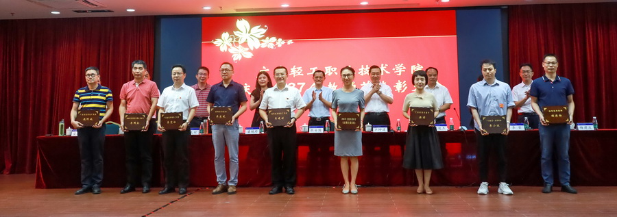 廖俊杰宣读关于表彰近两年获得省级及以上荣誉的个人或团队、服务轻院30年的教职工的决定。校领导分批向受表彰的教职工颁发奖牌。