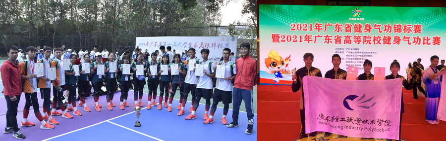 在2021年广东省健身气功锦标赛暨2021年广东省高等院校健身气功比赛中,全省34个代表队伍,共229人参赛。我校健身气功队由体育部主任杜少辉担任领队,张红雷老师担任教练员。本次比赛获得个人项目1金,集体项目2银。