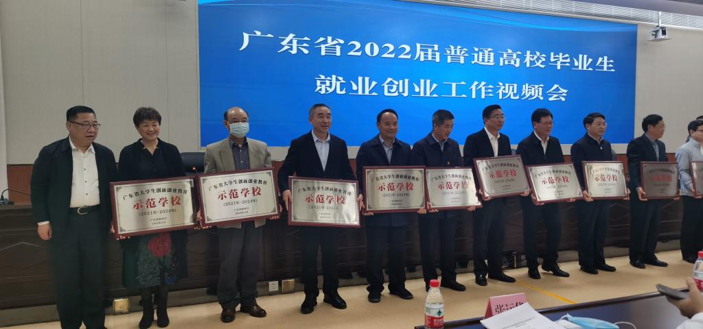 会议公布了2021-2024年广东省大学生创新创业教育示范学校名单,经过评选,我校等10个学校被评为“广东省大学生创新创业教育示范学校”。会上举行了广东省大学生创新创业教育示范学校的授牌活动,廖俊杰代表学校上台接受牌匾。