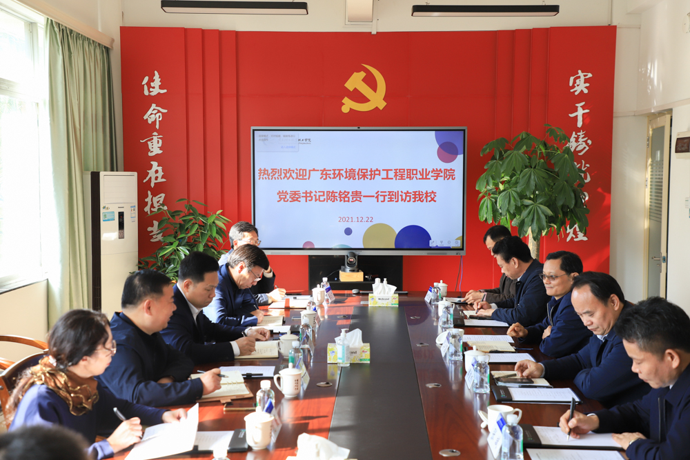 12月22日上午,广东环境保护工程职业学院党委书记陈铭贵一行8人到访我校,学校党委书记杜安国、副校长廖俊杰在广州校区二楼会议室接待了客人,双方就“双高计划”建设等方面进行深入交流。