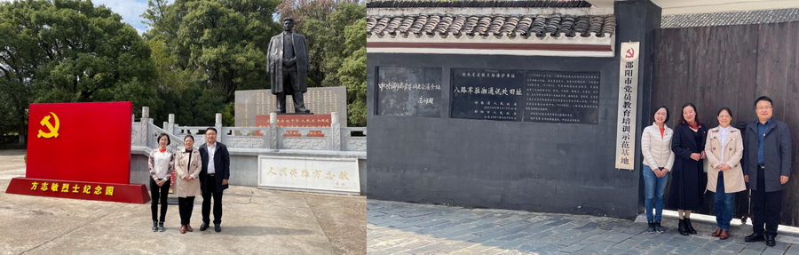 10月25日-26日,马克思主义学院党总支负责人余展洪、支部书记刘红卫和管理学院教师支部书记林丽青一行到湘中幼儿师范高等专科学校、江西青年职业学院开展专业调研和样板支部建设工作交流。调研期间,不忘开展党史学习教育实践,先后赴八路军驻湘通讯处旧址和方志敏烈士纪念园开展党史实践。
